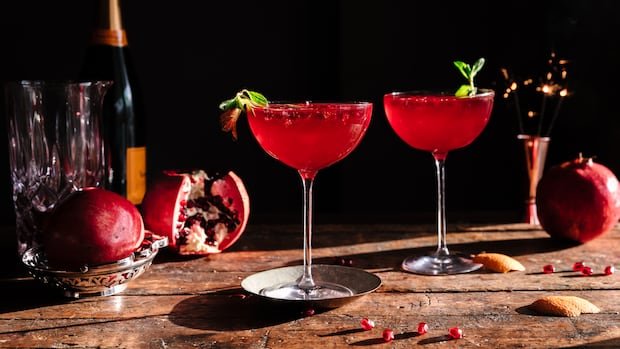 5. Sprinkle a tablespoon of pomegranate arils into each cocktail.